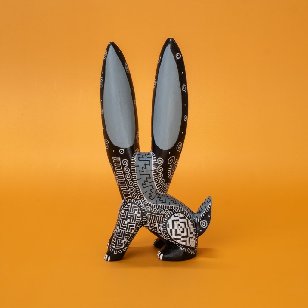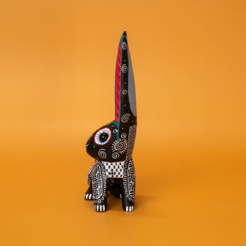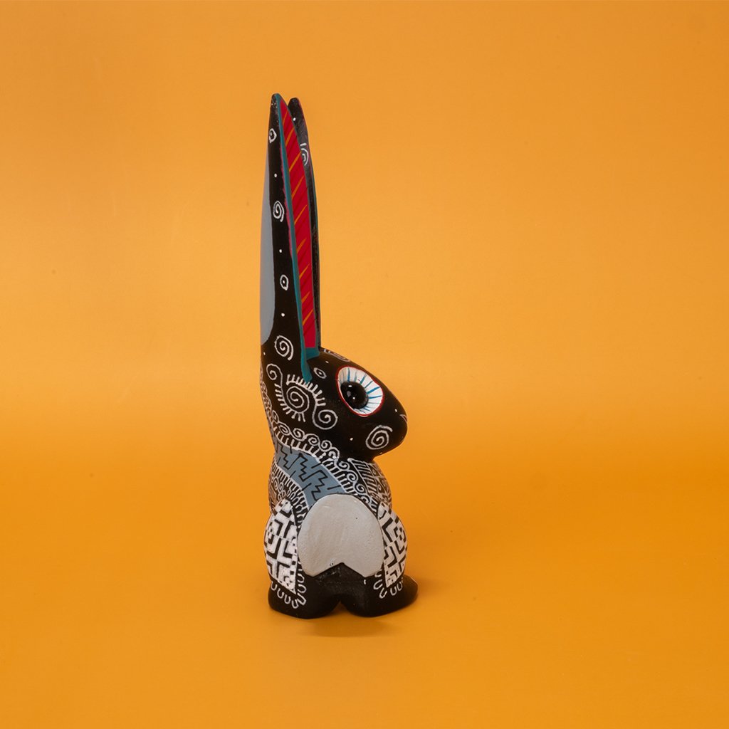 Este tierno conejo orejón, tallado en madera de copal y pintado a mano, es una joya del arte popular mexicano. Con medidas de 13 cm de alto, 6.5 cm de ancho y 4 cm de fondo, destaca por sus largas orejas y su expresiva personalidad.