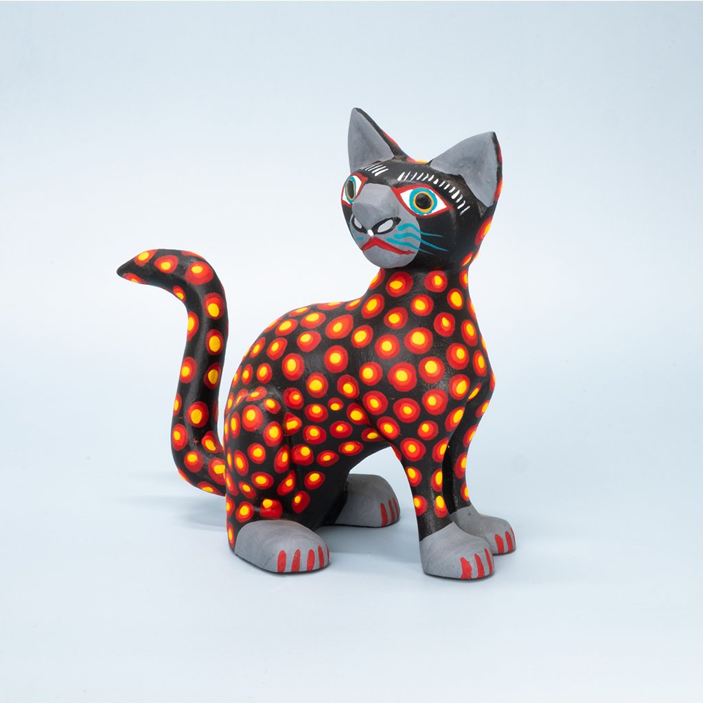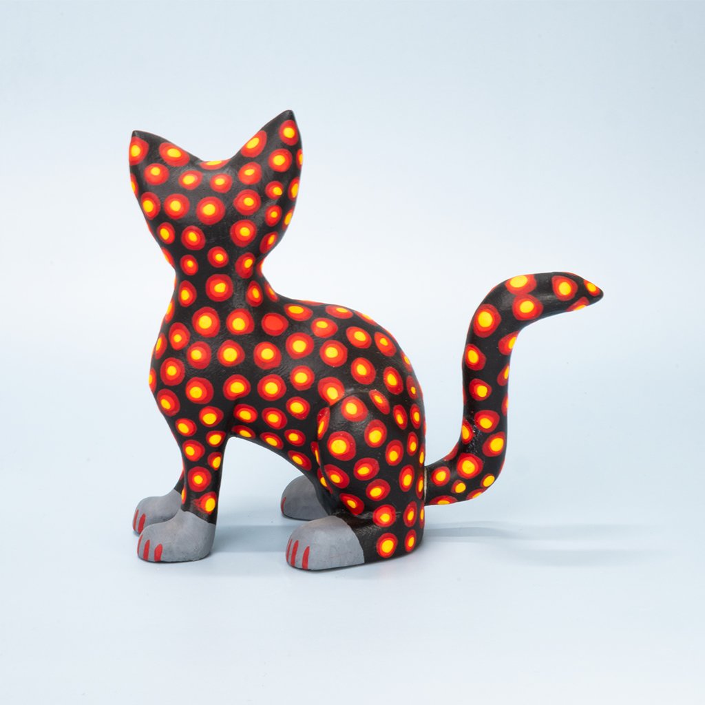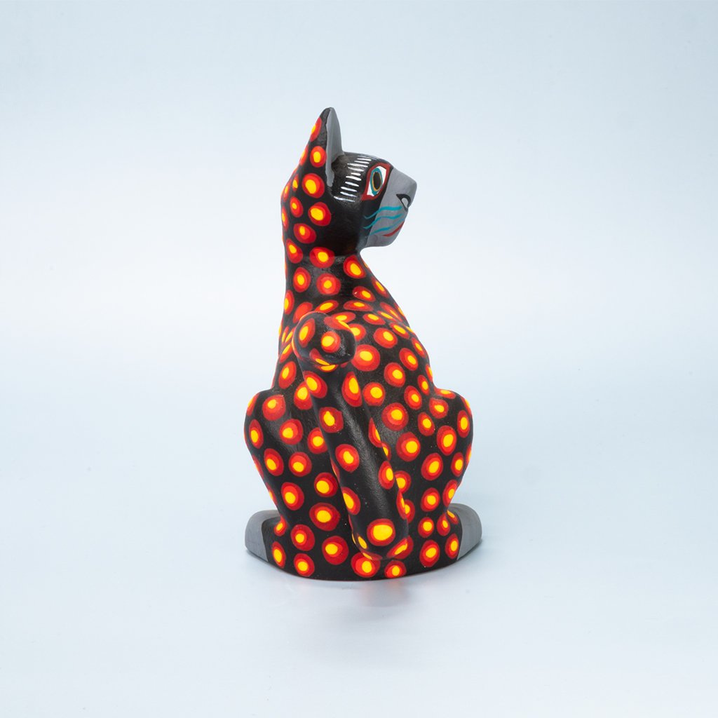 Este encantador gato tallado en madera de copal y pintado a mano es una expresión única del arte popular mexicano. Con medidas de 12 cm de alto, 8 cm de ancho y 7 cm de fondo, es una pieza ideal para dar vida y color a cualquier espacio.