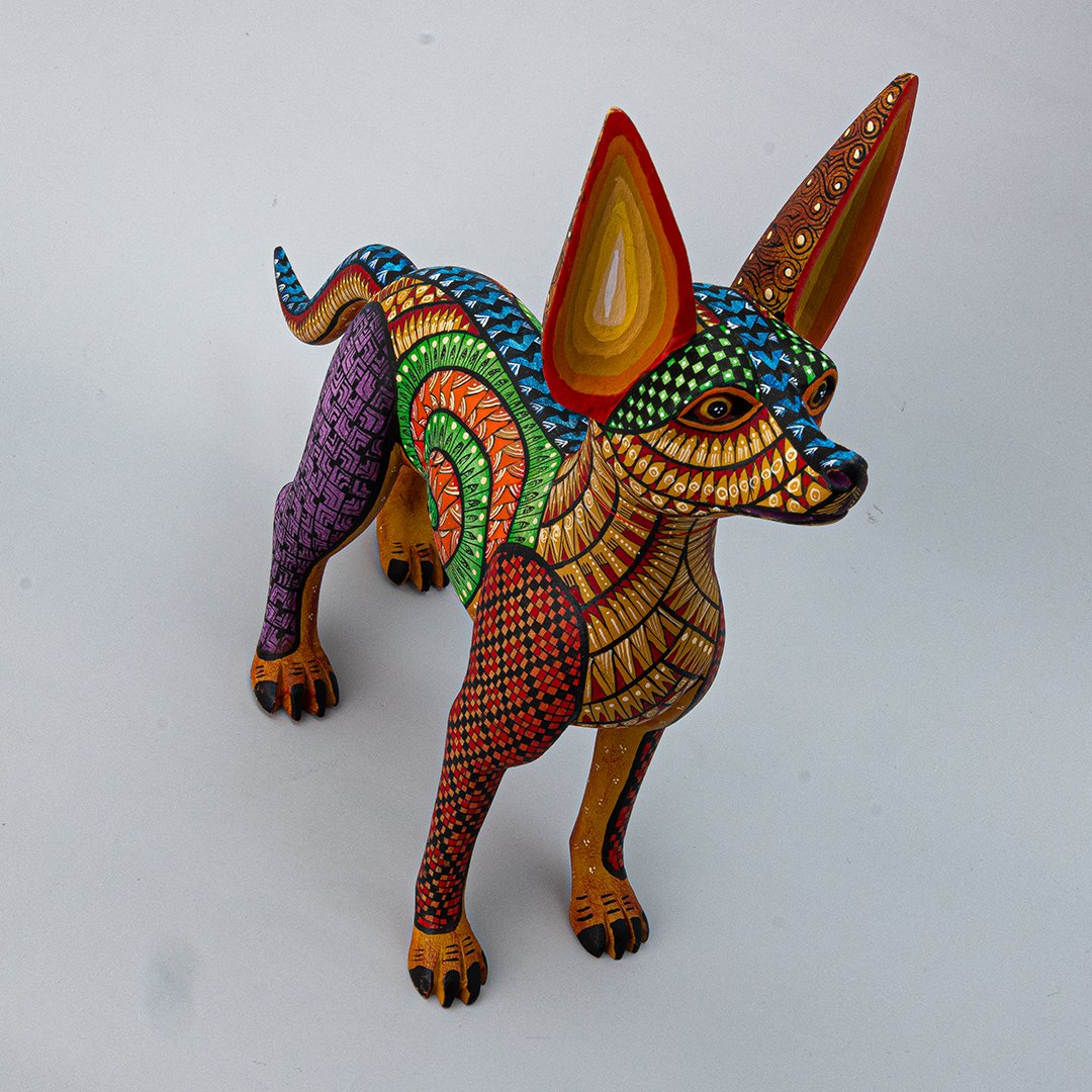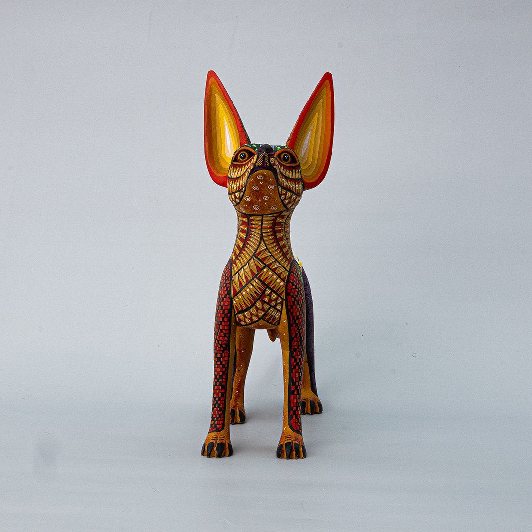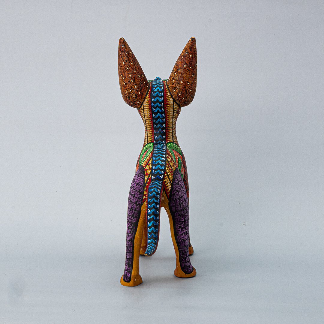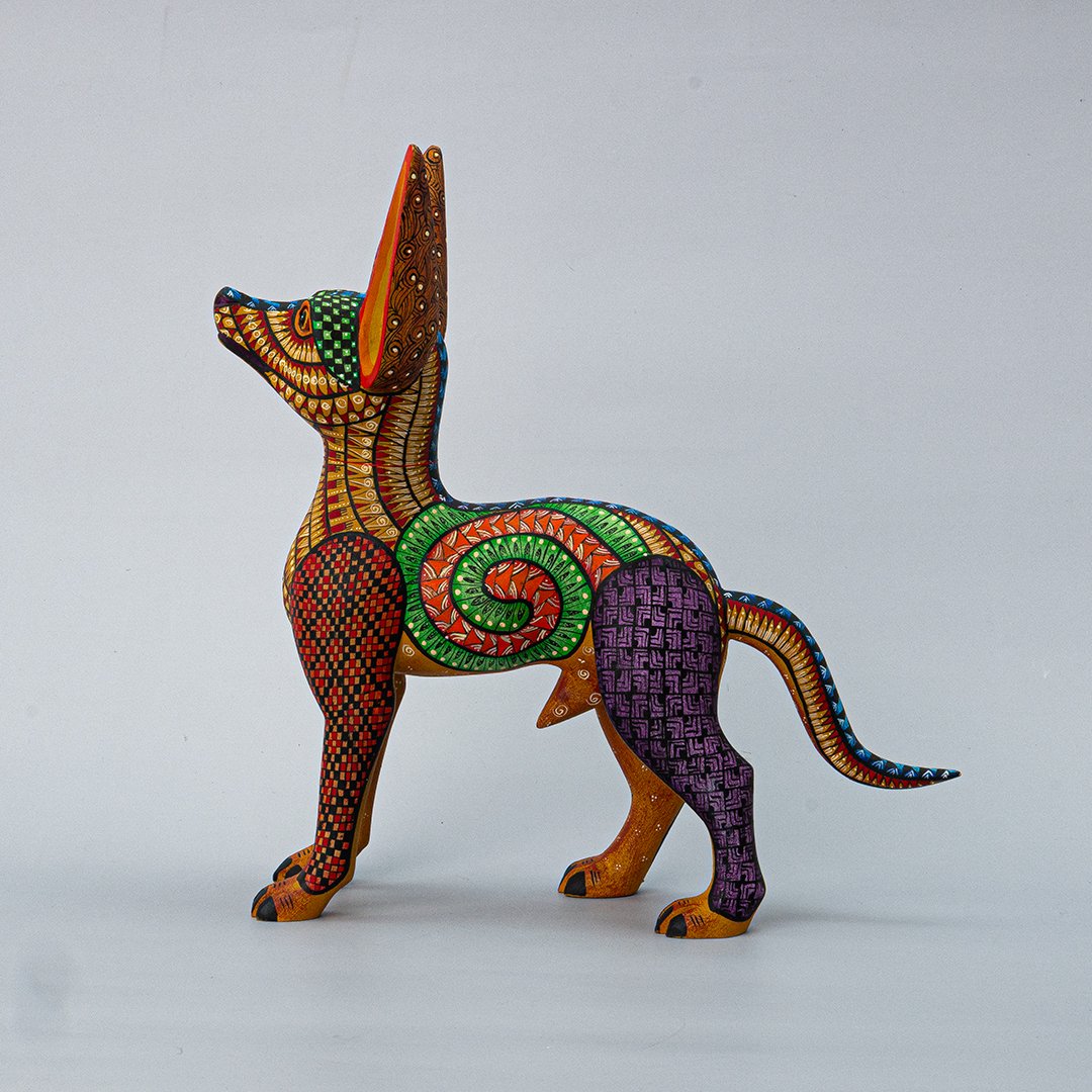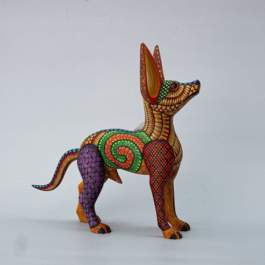 Celebra la herencia zapoteca con esta magnífica representación del xoloitzcuintle, símbolo ancestral de protección y guía espiritual. Esta pieza ha sido tallada en madera con maestría artesanal y decorada a mano con líneas finas y detalles minuciosos, resaltando la nobleza y la presencia mística de este perro sagrado. Esta pieza es perteneciente a nuestra Cooperativa de Diferentes artesanos.